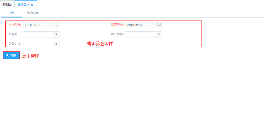 第一步:根据筛选条件进行查询,针对开始时间、结束时间、资金账户、账户类型、收款方式,根据实际需求进行选择;