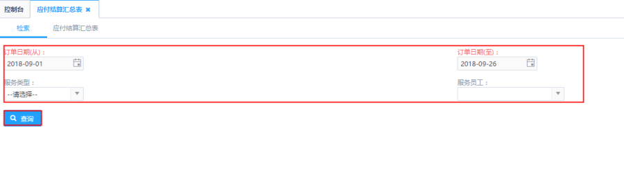 第一步:根据筛选条件进行查询,针对订单日期、服务类型、服务员工筛选条件根据实际需求进行选择。