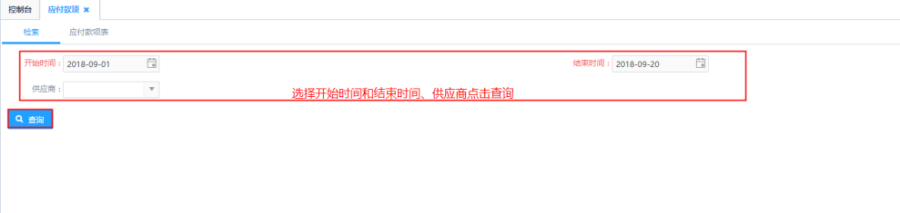 第一步:根据筛选条件进行查询,针对开始时间、结束时间、供应商,根据实际需求进行选择;