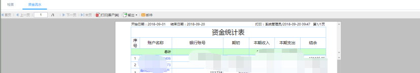 第二步:点击查询即可得到资金流水表,账户的本期收入和支出的账目统计,点击账户名称可以查看该账户资金流水的记录明细,具体到每一个订单。