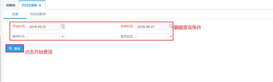 第一步:根据筛选条件进行查询,针对开始时间、结束时间、费用科目、费用类型筛选条件根据实际需求进行选择。