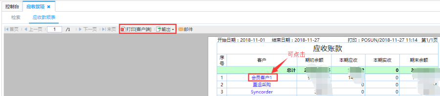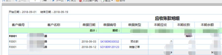 第三步:点击查询即可得到应收账款明细表,针对客户的应收账款明细统计,可点击该客户下的单据编号或者关联单号查看该客户的应收款项明细。