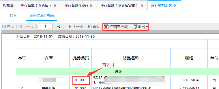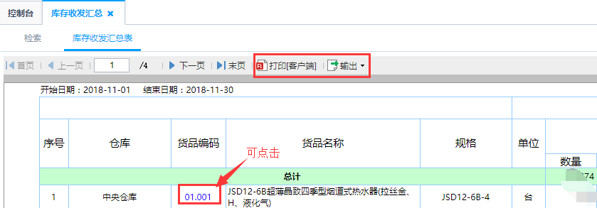 第二步:点击查询即可得到如图库存收发汇总表,统计在限定时间内仓库的收发货汇总,包括期初的数量和金额信息、收入发出所对应的数量、金额信息以及期末的数量和金额信息;点击产品编码可查看到该产品的库存收发明细信息,具体到每一个订单信息
