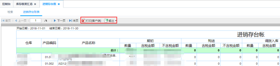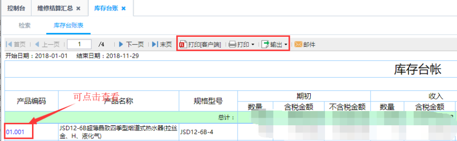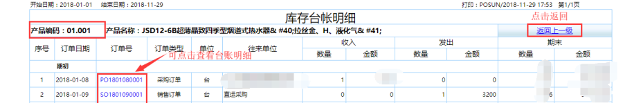 第三步:点击查询即可得到如图库存台账表,检索统计类型。如以产品为统计类型,统计所有的产品的期初、收入、发出和期末等数量、含税金额和不含税金额的库存信息:针对库存台账表中的产品编码点击可查看到该产品的库存台账明细信息,具体到每一个订单信息。