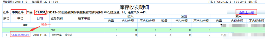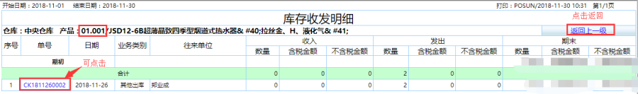 第二步:点击查询即可得到如图库存收发明细表,统计在限定时间内仓库的收发货明细,包括期初的数量,含税金额和不含税金额、收入发出所对应的金额数量以及期末的金额数量,可统计出该时间段的收发总额同时也可以通过对应的单号查看产品的具体信息。