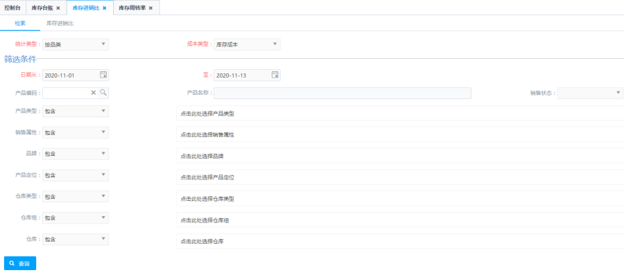 第一步:根据统计类型和成本类型进行查询,统计类型:按品类和按产品;成本类型分为库存成本和采购参考价。