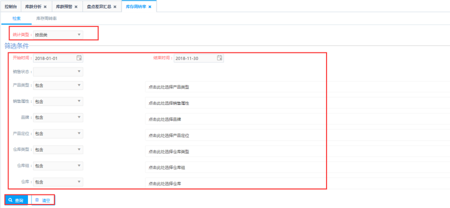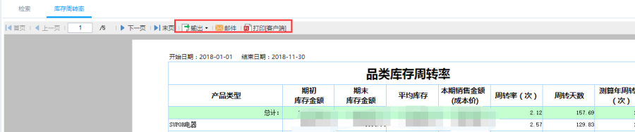 第三步:点击查询即可得到库存周转率表,检索统计类型。如以按品类为统计类型,统计产品类型的期初库存金额、期末库存金额、平均库存、销售金额(成本价)、周转率和周转天数等等库存周转信息。