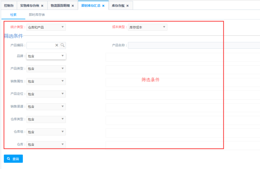 - 其他筛选条件:可根据产品的具体属性以及对应库存的相关信息进行约束查询;条件可多选。