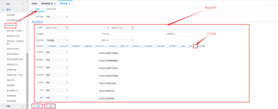 - 产品类型、仓库类型、仓库:选择包含或不包含后可多选或单选对应的筛选条件。
