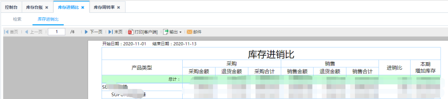 第三步:点击查询即可得到库存进销比表,根据统计类型查看库存里的产品类型的采购和销售的对比数据。
