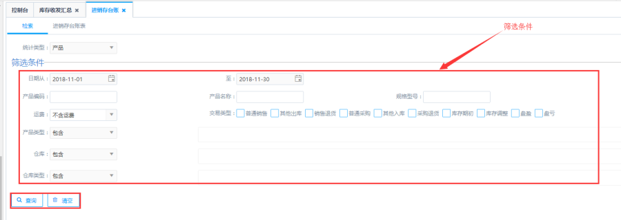 第三步:点击查询即可得到如图进销存台账表,检索统计类型。如以产品为统计类型,统计仓库下的所有的产品的期初、购进、调拨、销售、期末的库存信息。