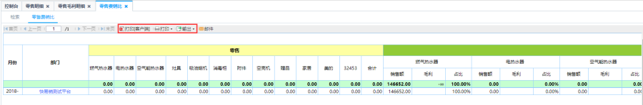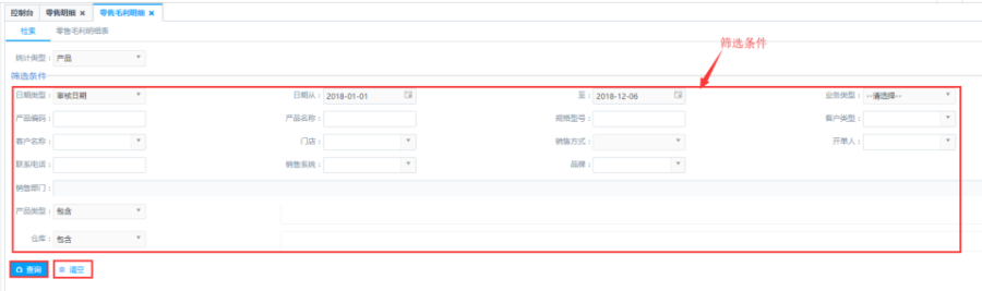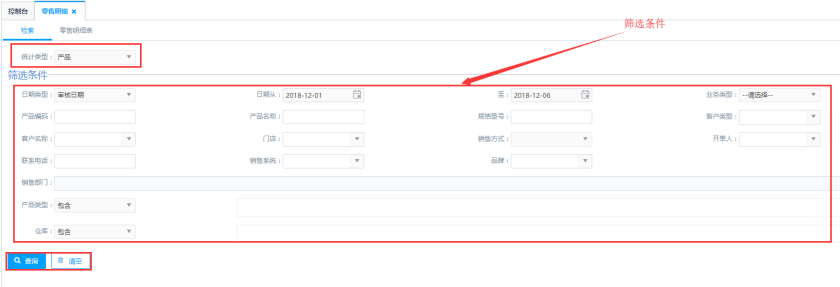 第一步:根据统计类型进行查询,统计类型分别为:产品、产品类型、销售部门、客户、开单人、门店等等;例如:需要统计具体到某个开单人的零售明细情况的时候对应的将统计类型选择为开单人进行查询。