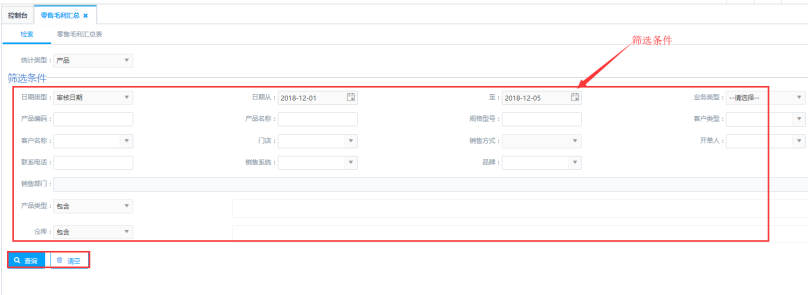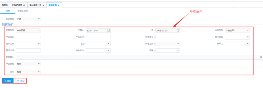 第一步:根据统计类型进行查询,统计类型分别为:产品、产品类型、销售部门、客户、开单人、门店等等;例如:需要统计具体到某个开单人的零售情况的时候对应的将统计类型选择为开单人进行查询。