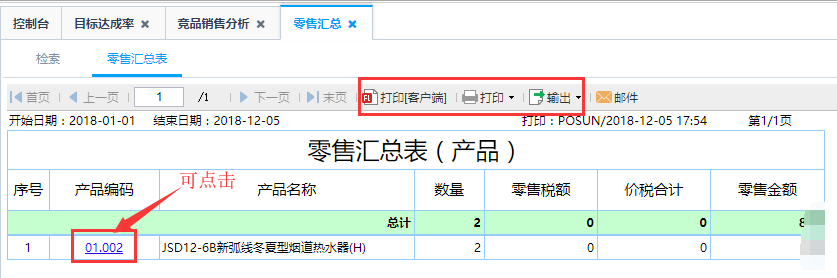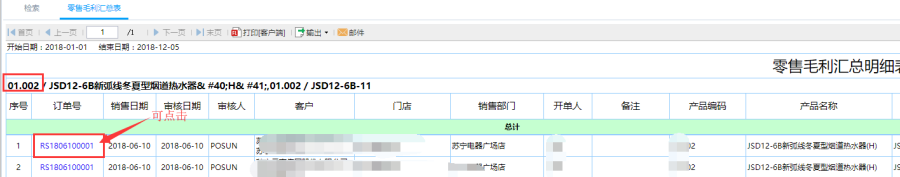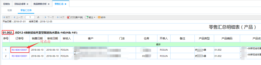 第三步:点击查询即可得到如图零售汇总表,针对零售汇总表中的产品编码点击可查看到该产品的零售明细信息,具体到每一个订单信息。