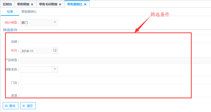 第三步:点击查询即可得到如图零售费销比表,针对零售、结算、人员工资、费用支出等信息进行统计。