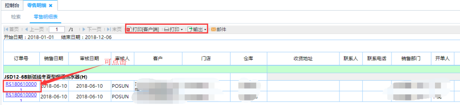 第三步:点击查询即可得到如图零售明细表,零售明细表为每一个产品所对应到每个零售订单或零售退货单上,可以查看到该产品在此单据对应的所有信息,如客户、门店、部门数量、价格信息等等;