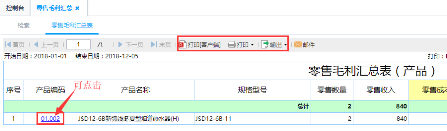 第三步:点击查询即可得到如图零售毛利汇总表,根据零售成本、毛利、毛利率、结算金额等信息进行统计分析,并且点击产品编码可查看到该产品的零售明细信息,具体到每一个订单信息。