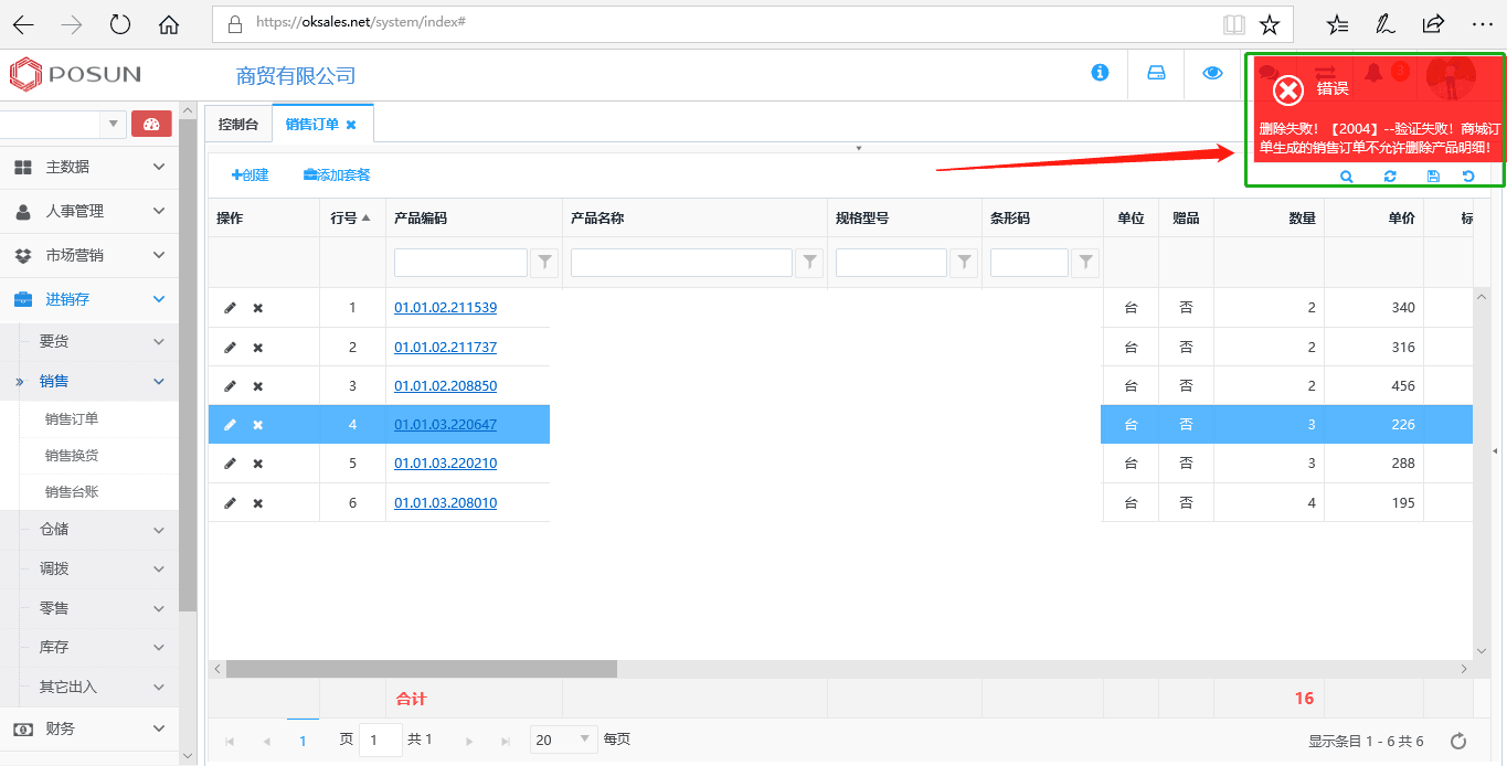 删除失败! [2004] -验证失败!商城订单生成的销告订单不允许删除产品明细!
