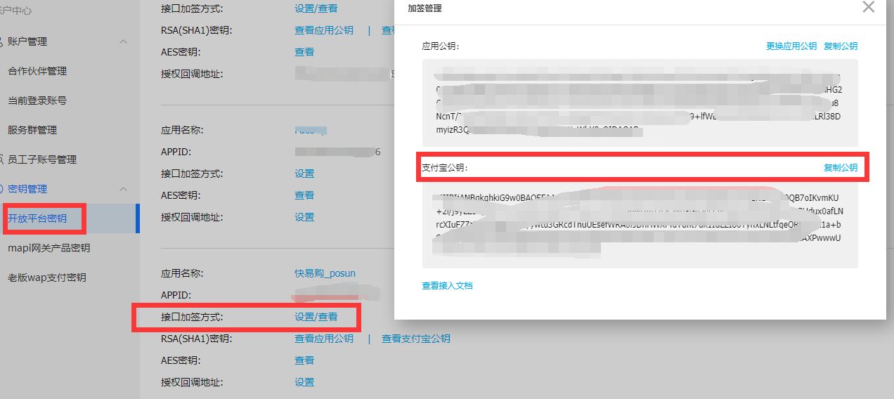8. 选择开放平台密钥, 应用名称为已接入快易购的应用,点击接口加签方式,然后查看支付宝公钥 ,对应资金账户内的 支付宝公钥
